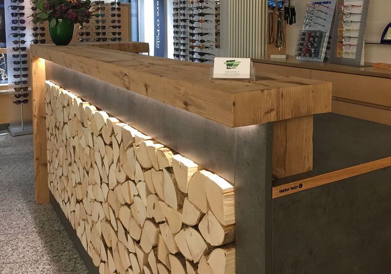 Das Optikstudio Haas in Villingen verschafft Ihnen den richtigen Durchblick und begrüßt Sie mit seiner neuen Empfangstheke von faktor holz.